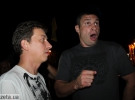 — Скоро випустимо нову пісню, — додає телеведучий 43-річний Антін Мухарський, який останнім часом виступає з проектом "Лагідна українізація". — Перед нею буде вірш: "Із своїм північним братом розмовляю тільки матом. Вибачай, родной народ, заї...али! Х... їм в рот!". Треба переходити до суворої українізації — лагідна не допомагає.