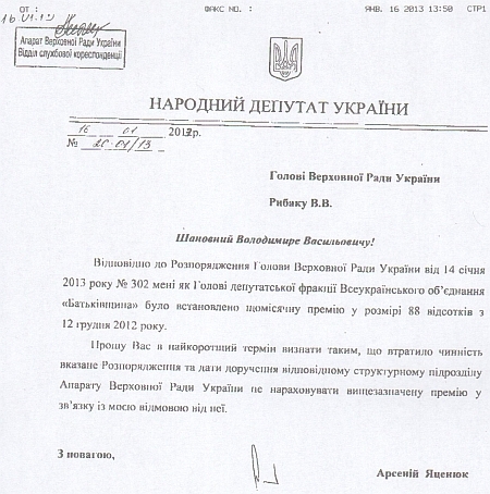 Соратники Яценюка надали копію листа до глави ВР Володимира Рибака від 16 січня 2013 року, яким Арсеній Яценюк вимагає в "найкоротший термін визнати таким, що втратило чинність" розпорядження про нарахування цієї премії.