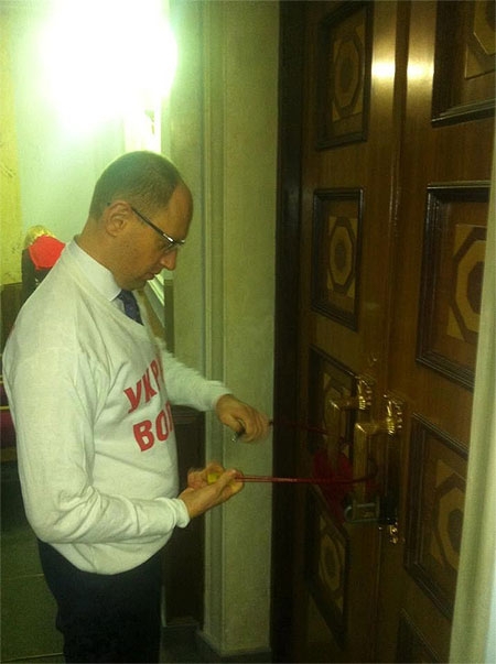 Журналісти можуть спостерігати за тим, що відбувається у сесійній залі лише через замкову щілину. У неї видно, що у залі сидять "УДАРівці" і депутати від "Батьківщини" у білих і червоних регланах. З зали лунає сміх.