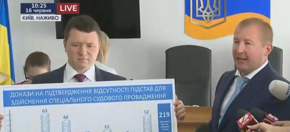 На підготовчому засіданні Оболонського суду у справі про державну зраду Віктора Януковича його адвокати принесли плакат.