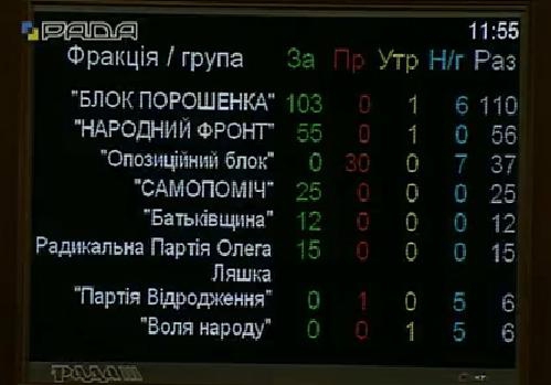 "Народний фронт" дав 55 голосів. Утримався головуючий регламентного комітету Павло Пинзеник. 33 були відсутні. Серед них - Михайло Гаврилюк, Людмила Денісова, Григорій Логвинський.