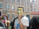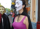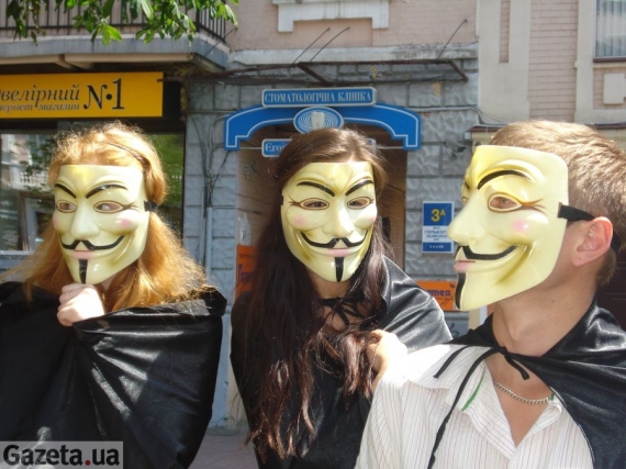 У вівторок близько 11.00 на вулиці Горького Києва молоді люди у масках із чорними плащами ставлять трибуну на алеї. Називають себе активістами Руху Гая Фокса. Кажуть, що прийшли пікетувати під стіни офісу партії УДАР.