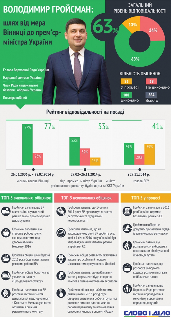 Серед загальної кількості обіцянок більшу частину Гройсман виконав - 63% (180). Не виконаними залишаються 24% (68), у процесі виконання - 13% (36) обіцянок.