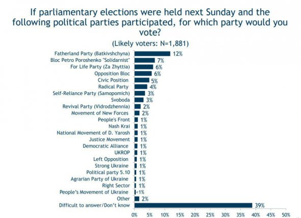 Так, згідно з американським опитуванням, якби парламентські вибори відбулися вже найближчим часом, лідером би стало ВО "Батьківщина" Юлії Тимошенко, яке підтримали 12% українців. На другому місці знаходиться "Блок Петра Порошенко" з результатом в 7% голосів. Третє місце зайняла партія "За життя" Вадима Рабіновича, яка на виборах набрала б 6%. Аналогічний результат (6%) і у "Опозиційного блоку". За ними слідують Радикальна партія Олега Ляшка - 4% голосів, а також об'єднання "Самопоміч" та ВО "Свобода", які отримали по 3% підтримки.
