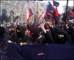 Учасники акції ультралівих організацій антифашистів і анархістів, що проходять в центрі Києва, запалюють фаєри, кидаючи їх на дорогу, а також запалюють димові шашки, при цьому самі ж їх гасячи.