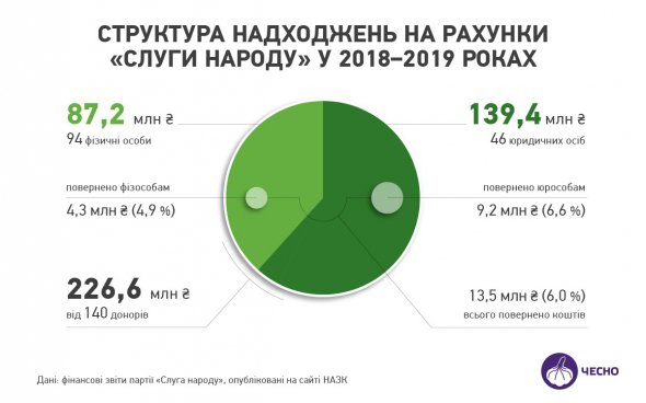 З моменту реєстрації партії "Слуга народу" минуло 2 роки. За цей час вона зібрала 226 млн грн внесків: 87 млн грн — від фізичних осіб і 139,4 млн грн - від юридичних. Партію профінансували 94 людини.