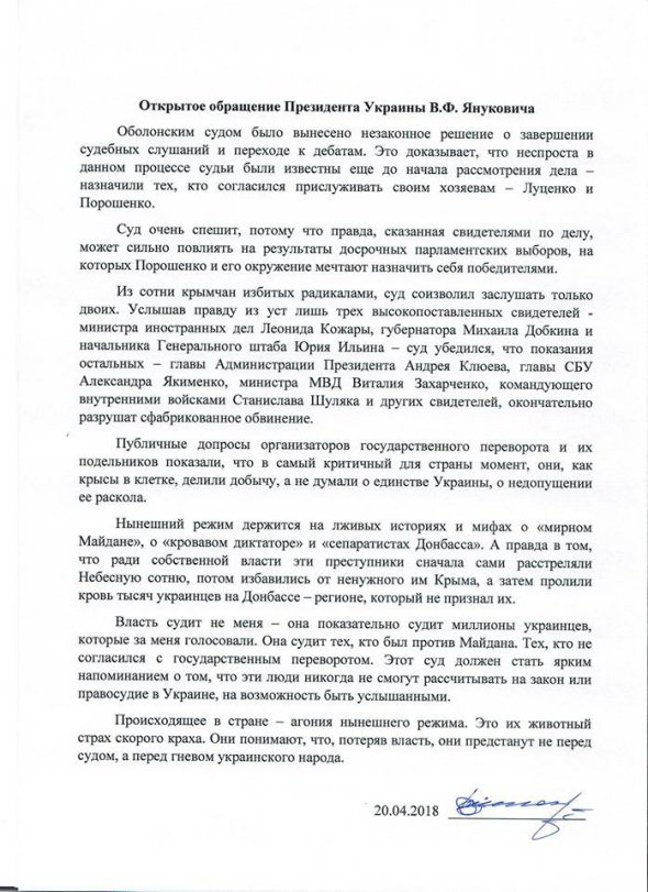 Президент-утікач Віктор Янукович написав відкрите звернення, у якому вкотре звинуватив у всіх бідах нинішню владу України.