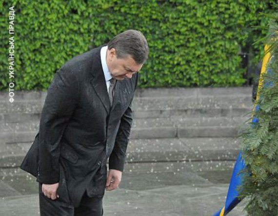 Інцидент стався під час офіційного візиту президента РФ Дмитра Медведєва до Києва. Покладання главами держав вінків до пам'ятника Невідомому солдату відбувалося під зливою та шквалами вітру, черговий порив якого відірвав один із вінків від кріплення і кинув просто на голову Януковичу.