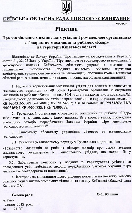 30 тисяч га Дніпровсько-Тетерівського лісгоспу віддали в оренду на 49 років "Товариству мисливців і рибалок "Кедр", яке пов'язують із Віктором Януковичем.