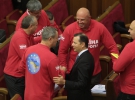 Ударівці прийшли на засідання у червоних регланах "Україна — це Європа" і з зображенням прапора Євросоюзу на спинах. Поміж депутатів ходять працівники держохорони, які зазвичай супроводжують Віктора Януковича.
