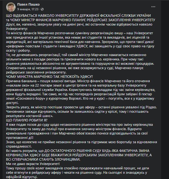 "Не дочекавшись реорганізації, той самий міністр Марченко намагається незаконно звільнити мене з посади ректора та призначити нового в.о. керівника. При чому такі рішення ухвалюються абсолютно не аргументовано та порушуючи всі можливі процедури. Спираючись на ці незаконні рішення, які вже оскаржуються у суді, Марченко планує рейдерське захоплення університету", - пише Павло Пашко.