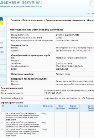 Зокрема, Міністерство внутрішніх справ оголосило про проведення тендеру на закупівлю чотирьох автомобілів Мерседес Е350, чотирьох автомобілів Audi А6 і 12 машин Toyota Camry.