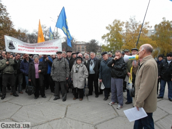"У виплатному центрі вимагали повернути кошти. Але нам відповідають, немає у держави грошей. То хай депутати менше крадуть з бюджету, щоб вистачало на пенсії простим людям, - заявив у гучномовець Віктор Сердюк, представник організації "Ніхто крім нас". - Нехай Янукович поверне Миргород-курорт, який украв. Чорнобильцям там немає вже місця, не можемо полікуватися. Будемо вимагати розпуск Верховної Ради".