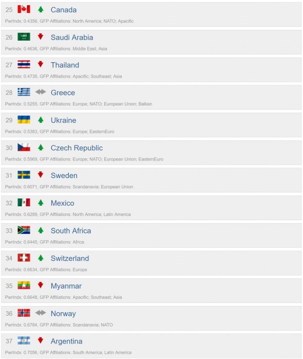 Згідно з Global Firepower, ця формула "дозволяє невеликим, але більш технологічно розвинутим державам конкурувати з більшими, але менш розвиненими", - пише Bellingcat.