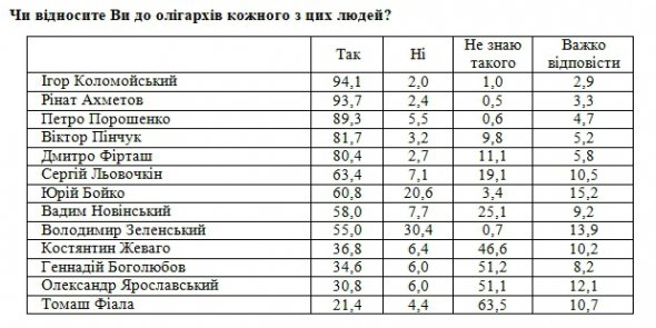 Найчастіше люди називали олігархами Ігоря Коломойського, Ріната Ахметова й Петра Порошенка, свідчить опитування Центру Разумкова, проведене на замовлення телеканалу "Еспресо".