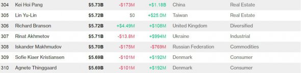 Ахметов зайняв 307-у позицію. За підрахунками агенції, він останнім часом втратив $13,8 млн. При цьому за останній рік статки українського олігарха збільшилися на $994 млн.