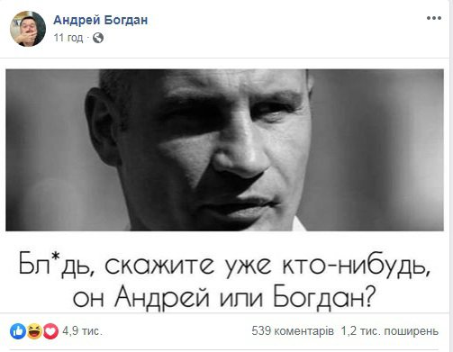 Під фото Кличка він написав: "Бл*дь, скажите уже кто-нибудь, он Андрей или Богдан?".