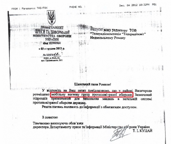 "У відповідь на ваш запит повідомляємо, що у районі Вишгорода розміщено мобільну вогневу групу протиповітряної оборони. Зазначений підрозділ призначений для виконання завдань в загальній системі протиповітряної оборони держави", - йдеться у відповіді.