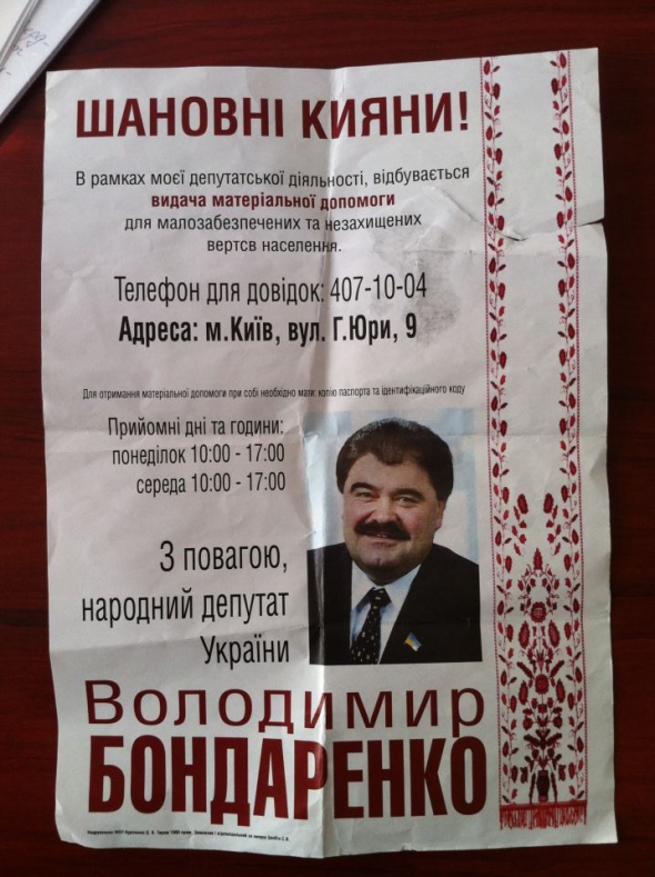 "Бютівець" Володимир Бондаренко називає провокацією розповсюджені листівки із його зображенням та написом: "В рамках моєї депутатської діяльності, відбувається видача матеріальної допомоги для малозабезпечених та незахищених верств населення". Про це він сказав в коментарі Gazeta.ua.