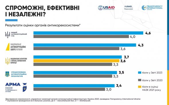 Антикорупційні органи оцінювали за п'ятибальною шкалою, де 5 - максимальний бал, 1 - мінімальний.