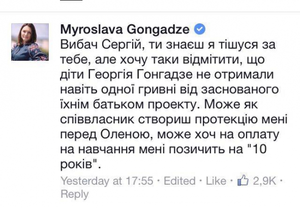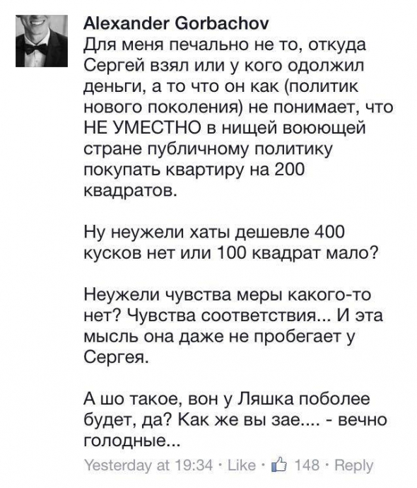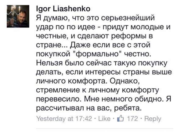 На своїй сторінці в Facebook нардеп написав, що частина грошей на покупку - це його заощадження "як колишнього співвласника "Української правди". Крім цього в 2013-2014 роках він задекларував дохід понад 100 тисяч доларів. Частину грошей взяв у своєї дівчини - діджея Анастасії Топольської.