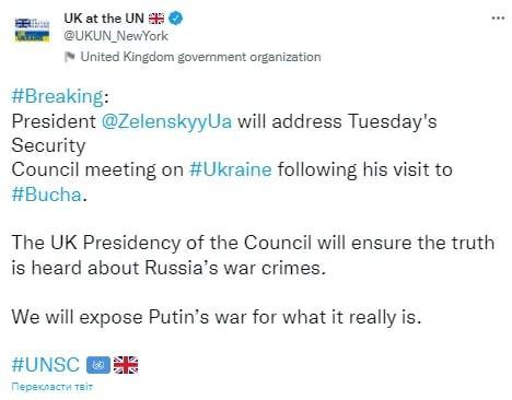 "Сьогодні на засіданні Радбезу ООН щодо України виступить президент Зеленський після його візиту до Бучі на Київщині. Ми покажемо реальну путінську війну такою, якою вона є насправді", - йдеться у повідомленні.