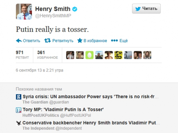 Британський парламентарій Генрі Сміт у своєму Twitter назвав президента РФ Володимира Путіна "онаністом ". За це отримав гнівну відповідь від прем'єр- міністра країни Девіда Кемерона.