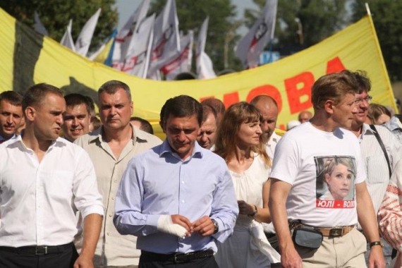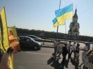 Уздовж вулиці Грушевського через кожні п'ять метрів стояли молоді люди з прапорам Об'єднаної опозиції ВО "Батьківщина".
