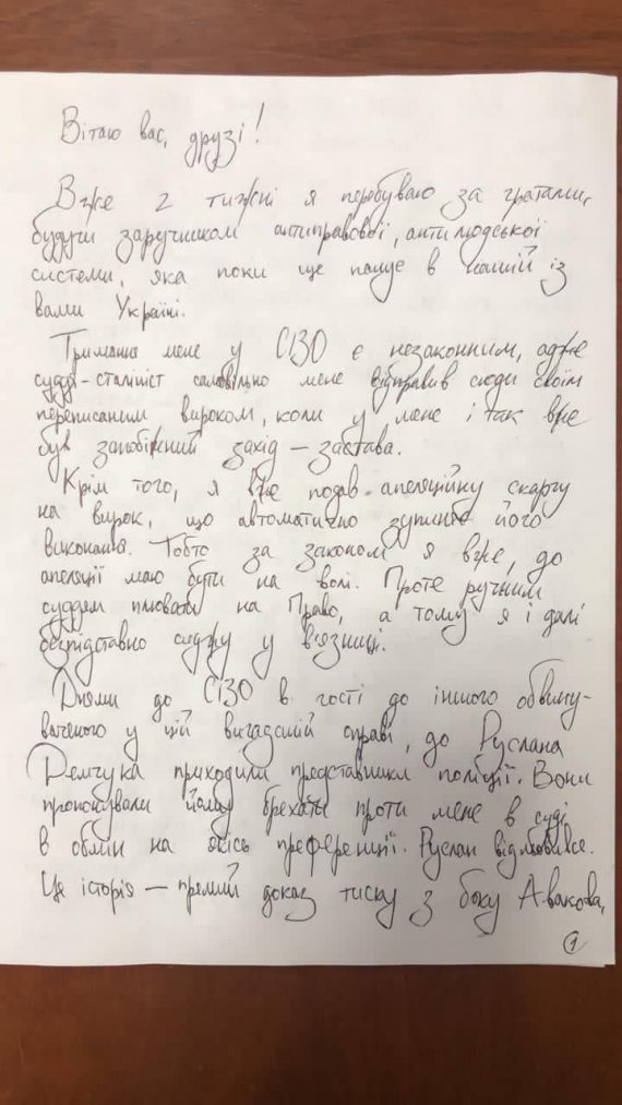 "Днями до СІЗО в гості до іншого обвинуваченого у цій вигаданій справі, до Руслана Демчука, приходили представники поліції. Вони пропонували йому брехати проти мене в суді в обмін на якісь преференції. Руслан відмовився. Ця історія - прямий доказ тиску з боку Авакова, який далеко не вперше переступає через Закон, аби помститись мені за критику.
