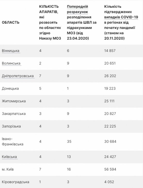 Потреби областей відрізняються від тих, які були заплановані ще у квітні. Наприклад, якщо раніше Полтавська потребувала лише 1 апарат, то нині з першої партії туди має потрапити вже 5 штук. Чернівецька, куди планувалося привезти 30, з нинішньої поставки отримає тільки 3, куплених за кошти з Covid-фонду.