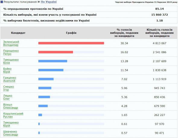 Такий результат оприлюднила ЦВК за результатом підрахунку 85.14% голосів.