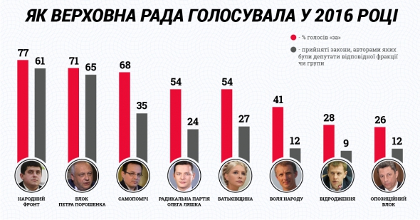 "Самопоміч", Радикальна партія Олега Ляшка та "Батьківщина", попри заяви про перебування в опозиції, підтримали ¾ прийнятих 2016 року законів.