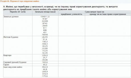 У декларації про доходи за 2014 рік, оприлюдненій на сайті парламенту, зазначається, що володіє вісьмома житловими будинками, трьома квартирами, садовим будинком, гаражем та дев'ятьма земельними ділянками, повідомляє Українська правда.
