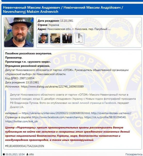 "Центр "Миротворець" просить правоохоронні органи розглядати дану публікацію як заяву про вчинення цим громадянином усвідомлених діянь проти національної безпеки України, миру, безпеки людства та міжнародного правопорядку, а також інших правопорушень", - йдеться на сайті.