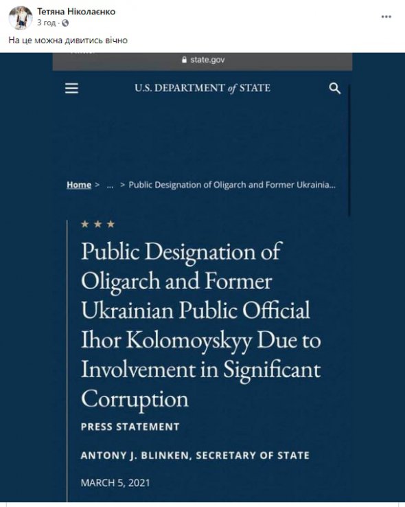 "Хочу висловити занепокоєння постійними зусиллями Коломойського, які тривають досі, щодо підриву демократичних процесів та інституцій в Україні. Вони становлять серйозну загрозу її майбутньому", - заявив держсекретар США Ентоні Блінкен.