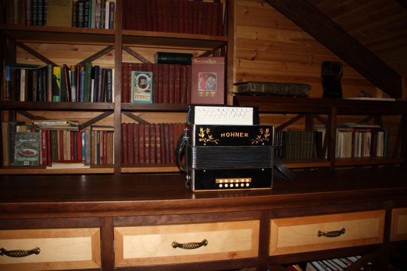 Роман Безсмертний зізнається, що любить старі речі. На стійці біля полиць з книгами - невеликий акордеон.