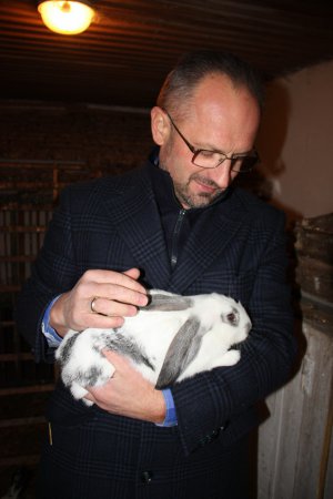 Поруч із курми - клітки для 28 кролів. Роман Петрович відчиняє одну, бере на руки біло-чорного кроля.