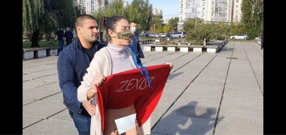 Коли Зеленський із першою леді йшли до дільниці, їм назустріч вибігла дівчина зі свистком. Вона звинуватила президента в сексизмі. І задерла спідницю червоного кольору.