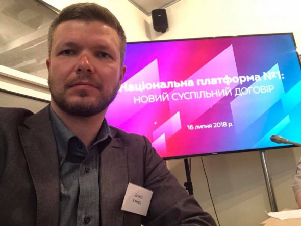 Він позує на фоні банеру "Національна платформа: новий суспільний договір".