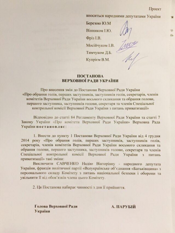 Народні депутати підписали проект постанови про виключення Надії Савченко зі складу комітету з питань національної безпеки й оборони.