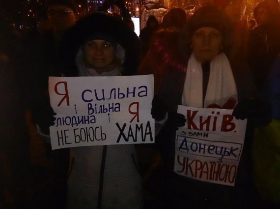 У Донецьку тепер двічі на день проходять акції в підтримку столичного евромайдана - о 12.00 та 18.00. Увечері 2 грудня на донецькому євромайдані зібралося близько 200 осіб. Більшість учасників акції - молодь. Мітингувальники написали плакати: "Схід і захід - разом!", "Кийок - аргумент трусів!", "Не стріляйте в дітей!", та інші.