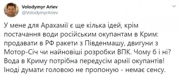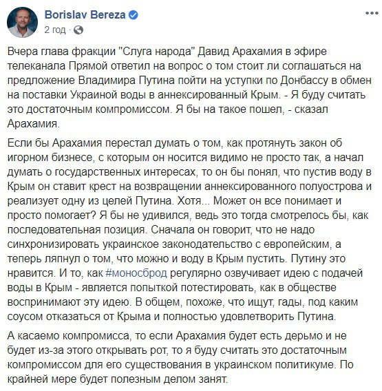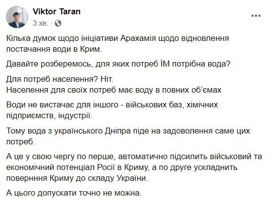 Напередодні голова фракції "Слуга Народу" Давид Арахамія заявив, що погодився б пустити воду до анексованого Криму в обмін на виведення російських військ із Донбасу та передачу окупованих територій під контроль України. Мотивував це тим, що в Криму "водою користуватимуться громадяни України".