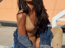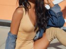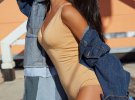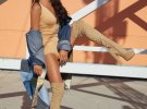 На фото засмагла зірка позує в бежевому купальнику і ботфортах.