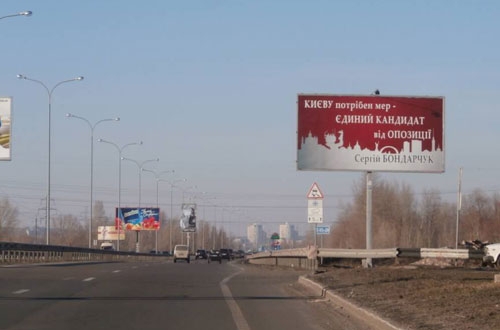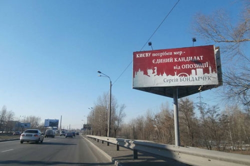 Так, білборди "Києву потрібен мер – єдиний кандидат від опозиції. Сергій Борндарчук" були помічені на вулицях Богатирській, Верхній Вал, Набережно-Хрещатицькій.