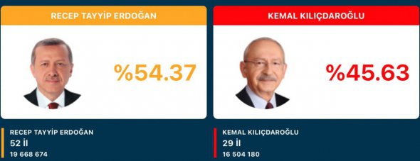 За даними державного агентства Anadolu після відкриття 97,12% виборчих урн, Ердоган отримав підтримку 52,21%, у Киличдароглу – 47,79%.