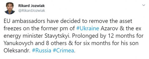 "Посли ЄС вирішили зняти замороження активів колишнього українського прем'єра Азарова та ексміністра енергетики Ставицького. На 12 місяців подовжили дію санкцій проти Януковича та 8 інших. Також на півроку - для його сина Олександра", - написав журналіст.