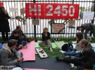 Біля мітингувальників запалені дві лампадки. У кількох на шиї — зроблені з картону колодки. В отвори просунуті руки. На паркані висить великий плакат із тканини "Ми - не раби. Раби — не ми". З-за дерева визирає міліціонер. Ще троє за 30 м спостерігають.