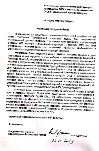 Російська газета "Коммерсант" опублікувала листи-погодження на "формулу Штайнмаєра", які надіслала Росія, бойовики з окупованих районів Донецької та Луганської областей і Україна. Підпис з українського боку ставив представник у Тристоронній контактній групі в Мінську, другий президент Леонід Кучма.