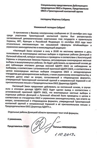 Тобто офіційні сторони перемовин (Україна, Росія, ОБСЄ) надсилали окремі листи на погодження формули, а не підписували єдиний документ. Бойовики також надсилали листи, хоча вони не є офіційними сторонами Тристоронньої контактної групи.