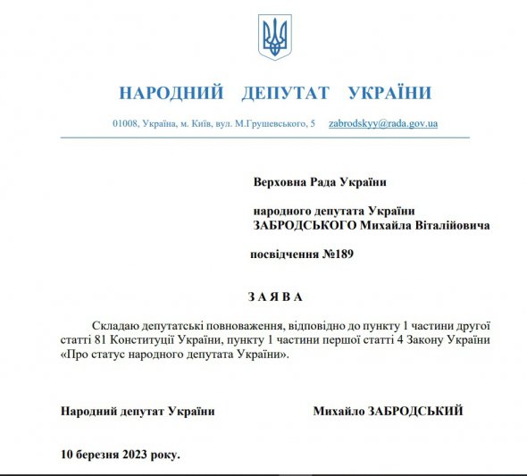 Народний депутат від "Європейської солідарності" Михайло Забродський складає повноваження.